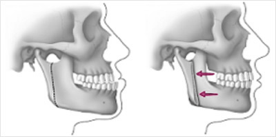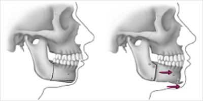 Correcting a protrusive lower jaw (protruding) consists in separating a posterior section from the anterior section (which contains the teeth). It is then placed (moved back) into the optimal position for aesthetics and function.